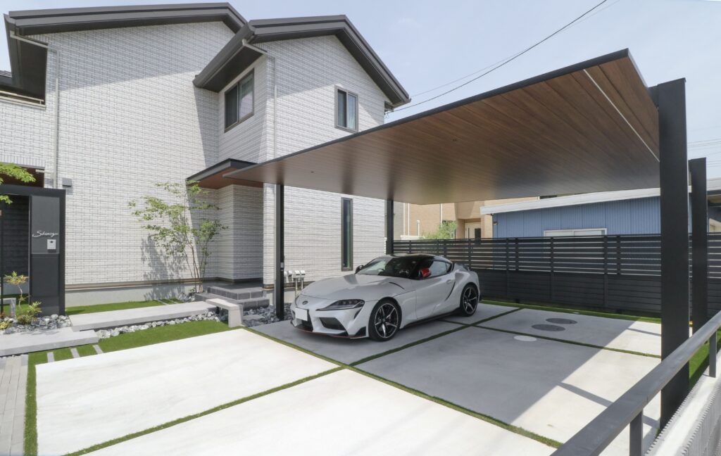 木調の軒天パネルのカーポートが目をひくモダン外構。<福山市神辺町>