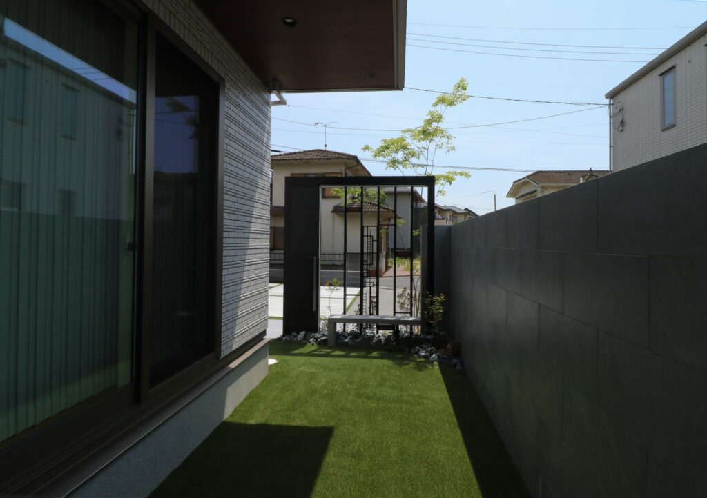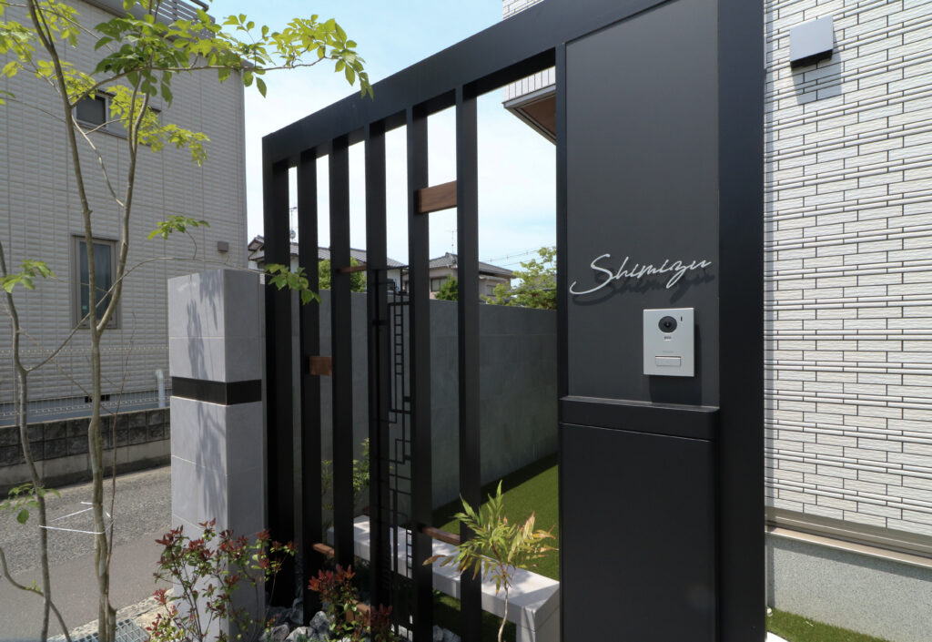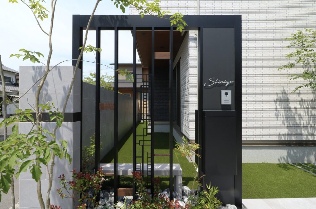 Gフレームやデザインパネルで造作した門柱と、閉塞感を和らげる植栽が訪れる方をやさしく迎えてくれます。